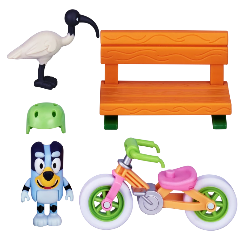 Includes: 1 x Bluey Figurine, 1 x Bicycle, 1 x Helmet, 1 x Park Bench and 1 x Bin Chicken.