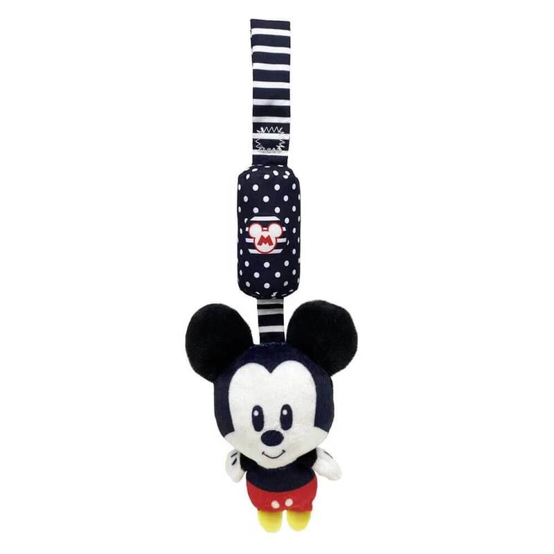 The Mickey Mouse on-the-go chime toy features a c-clip teether ring, printed pongee strap with chime inside. The plush has soft boa material and embroidered facial features with crinkle material inside.
