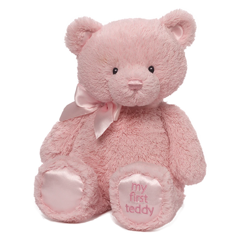 My First Teddy is crafted of super-soft plush, has satin paws, an organza ribbon around her neck, an embroidered nose.