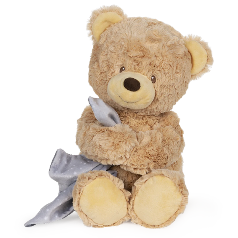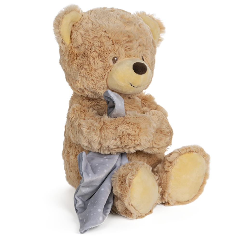 The Snuggly Sounds Lullaby Bear is made from GUND’s signature super-soft huggable plush in a beige colour and is featured holding tightly to a starry night patterned snuggle blanket.