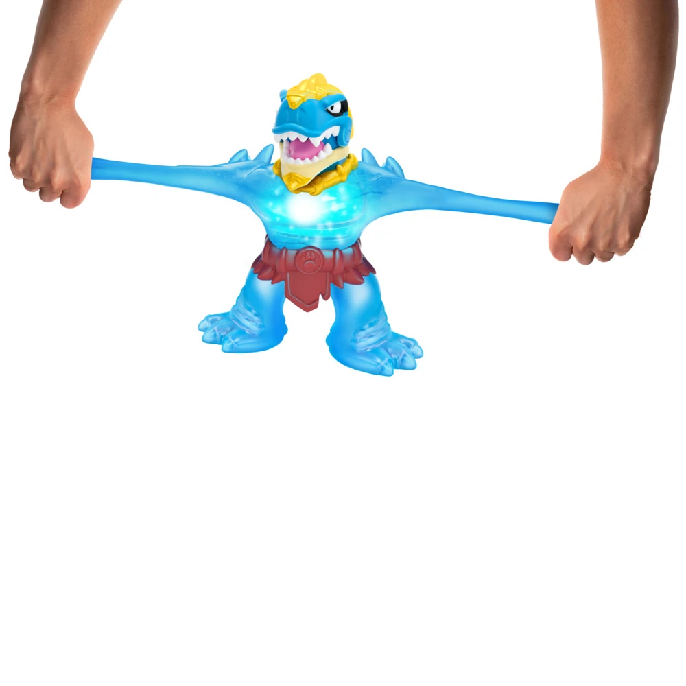 He is prepared for battle with motion activated lights and sounds! Squish and stretch his goo filled body and watch his inner goo energy light up from within! Dinogoo Tyro unleashes terrorizing sounds as you squeeze & stretch him!