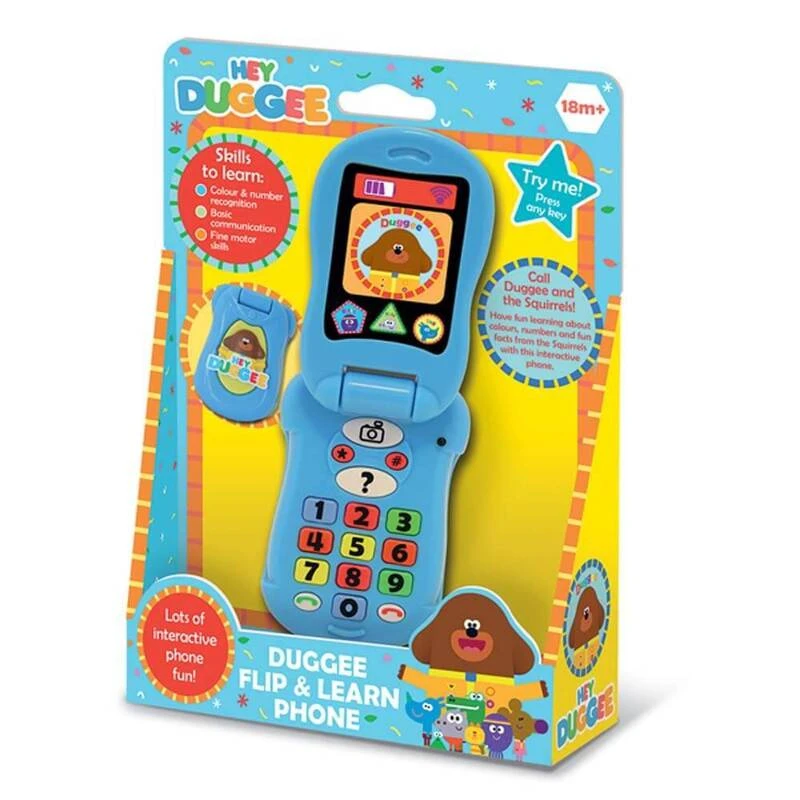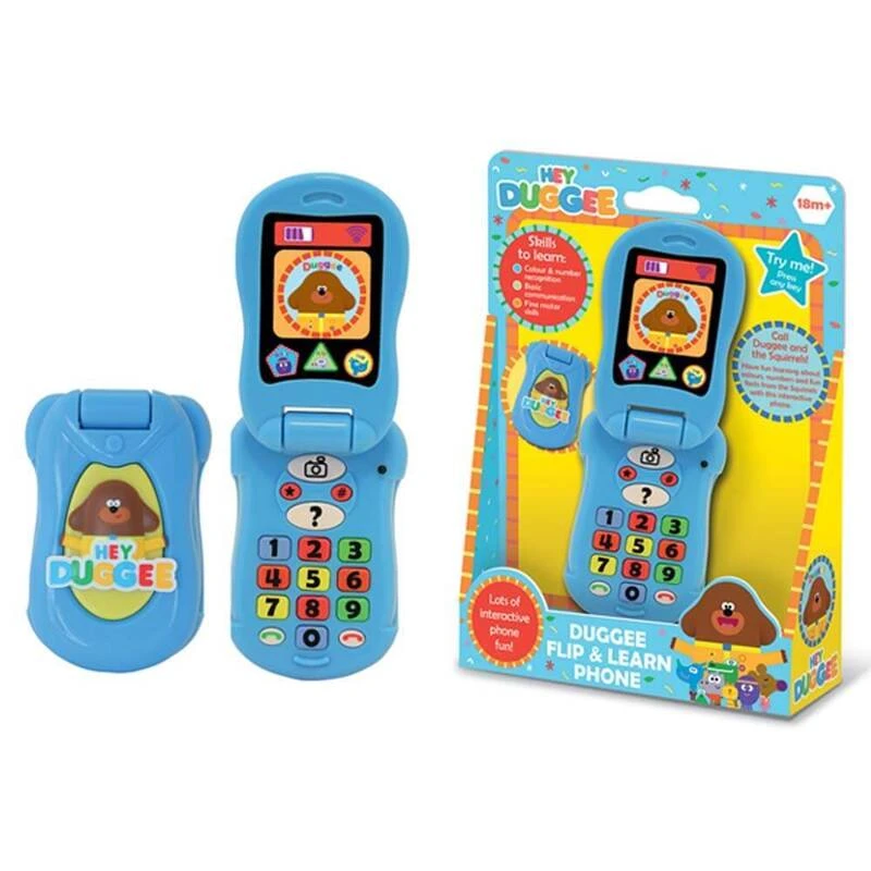 With lots of interactive fun, this Hey Duggee this Flip & Learn Phone is perfect for any little fan! Call Duggee and the Squirrels! Have fun learning about colours, numbers and fun facts from the Squirrels with this interactive flip up phone. It has a backlit screen and asks the child to find numbers and colours, listen to greetings and pretend to take pictures.
