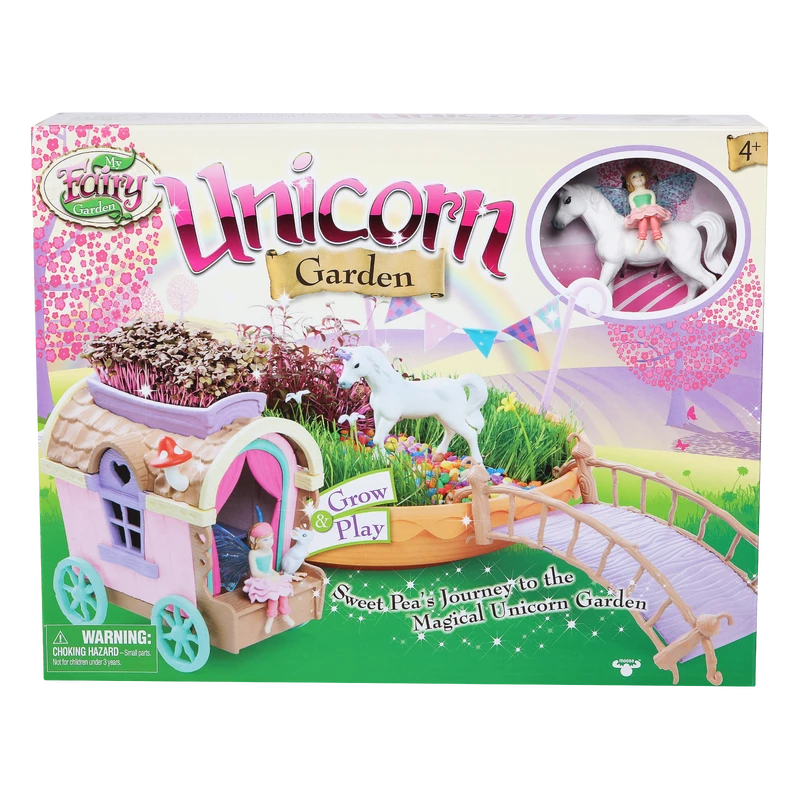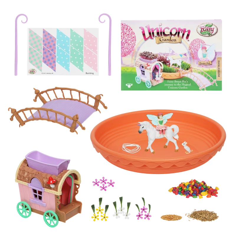 Includes: 1x Unicorn Garden Bowl, 1x Unicorn Figure, 1x Fairy Sweet Pea Figure, 1x Mouse Figure, 1x Fairy Caravan, 1x Fairy Bridge, 1x Posts with Cord and Bunting, 1x Rye Grass Seed, 1x Red Amaranth Seed, 1x Multi-Colour Gravel (for path), Fairy Flowers, Colour Instruction Booklet.