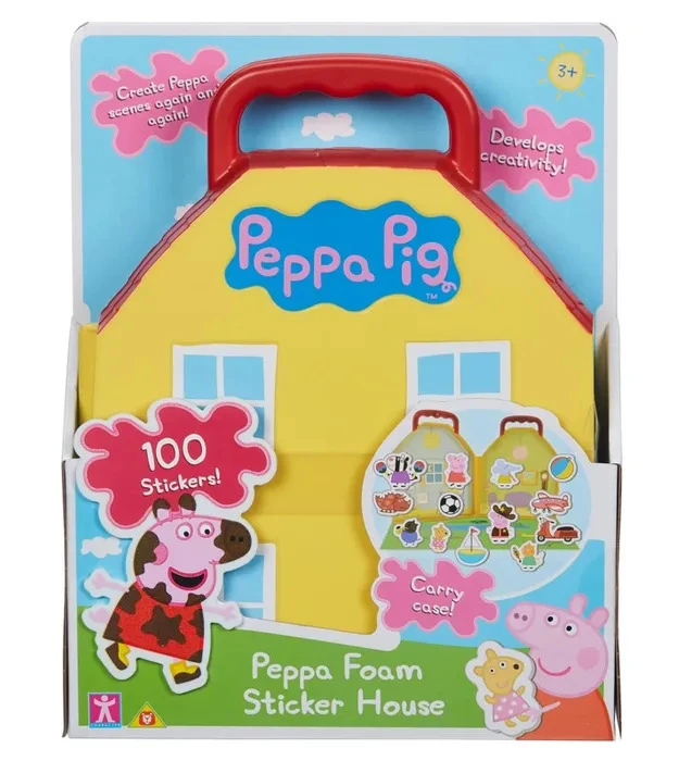 Open the house carry case to find a Peppa Pig scenic background and 100 reusable foam stickers, featuring lots of characters and accessories.